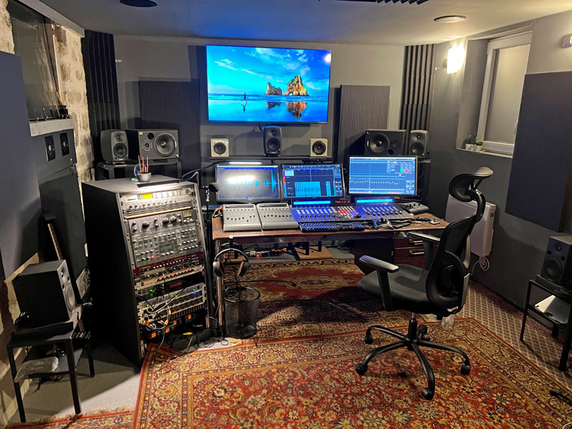24m2, 53m3 Mix Atmos 7.1.4, Surround 7.1, Surround 5.1 Quad, Ambisonie et Stéréo Contrôleur 24 faders motorisées ADR / Post Synchros Convertisseurs AN/NA RME 24 canaux ADAT. Nuendo SessionLinkPro |